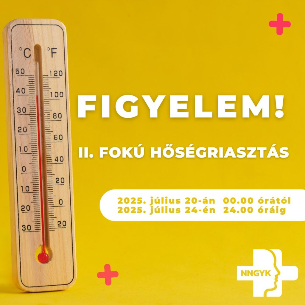 Az Országos Tisztifőorvos a HungaroMet Magyar Meteorológiai Szolgáltató Nonprofit Zrt. legfrissebb előrejelzése alapján július 20-án (vasárnap) 00.00 órától július 24-én (csütörtök) 24.00 óráig másodfokú hőségriasztást rendel el az ország teljes területére.